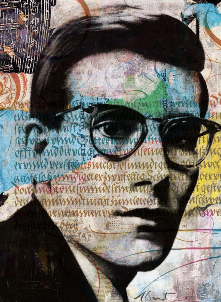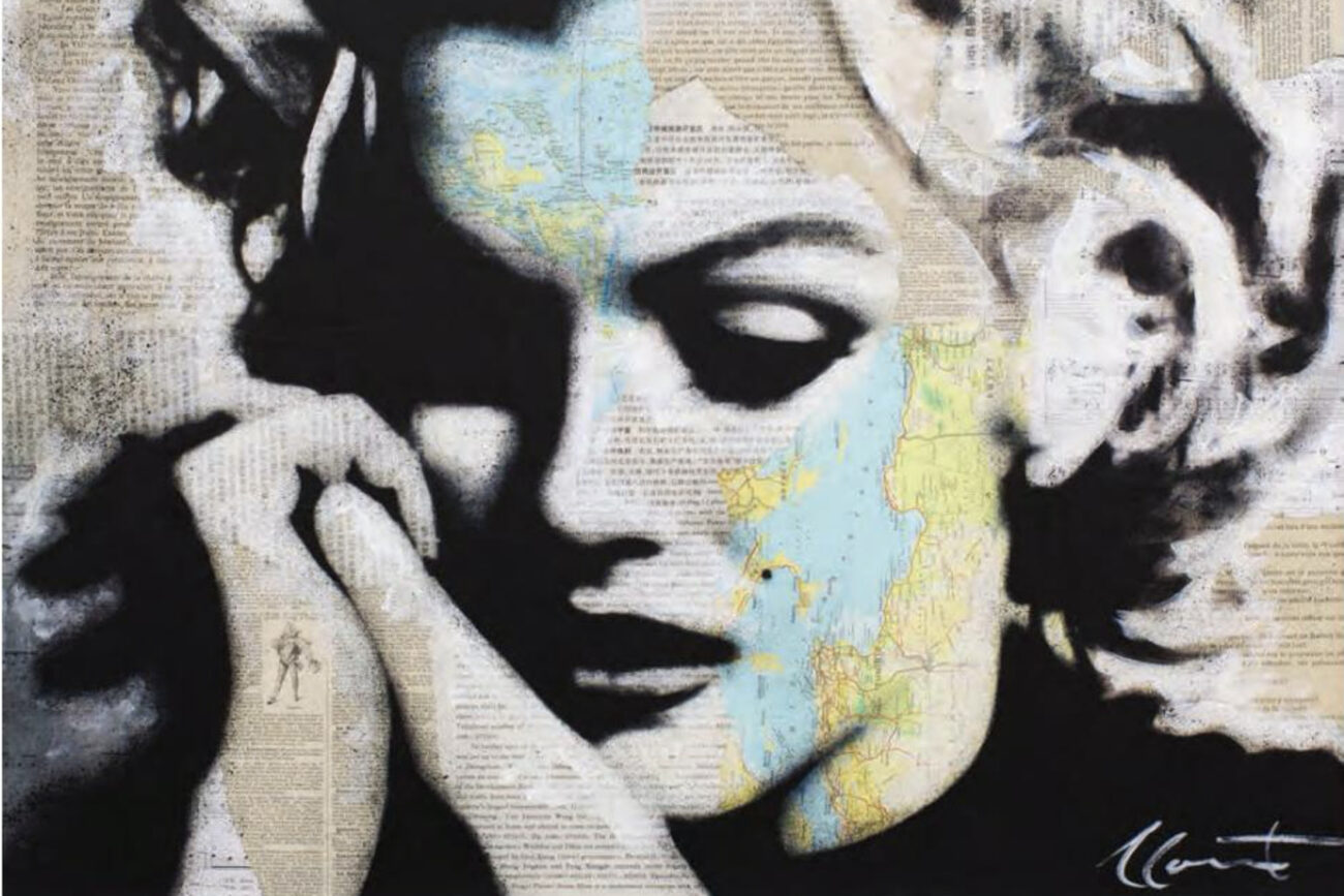 Although he started with abstracts, André soon turned toward portraits. “The face is the centre of our emotions. It reflects our soul, who we are.” Yves Saint-Laurent, Kate Moss, Brigitte Bardot, David Bowie and even Winston Churchill appeared under his brush. Adopting a technique that mixes collage, acrylic paint and a toothbrush for the finishing strokes, the artist creates portraits that are so realistic that the subjects seem to have been photographed. Pages of old books or maps are torn and then glued on to form a richly textured background that, when you look closely, can be read to various degrees. Whoever his subject is – artist, politician, celebrity – André spends long hours learning about them. He gets inside his characters, then offers his personal version in order to rewrite history in his own way. The final result is always breathtaking, alive with elegance and emotion.