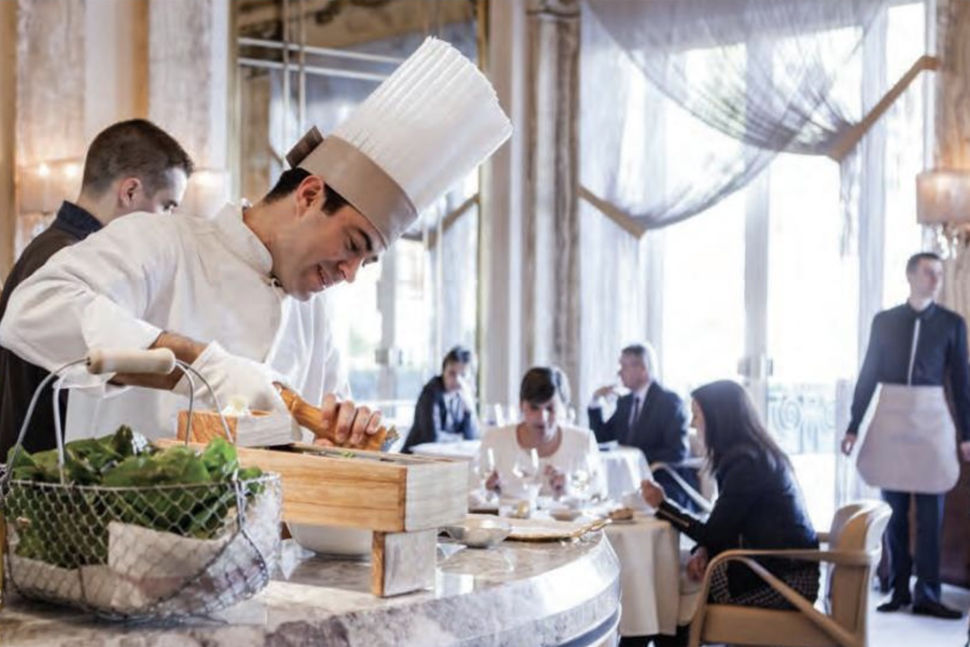 One thing that’s new at the Louis XV since it reopened is a magnificent and stately piece of furniture – the servery – located in the centre of the dining room. This is the hub around which the ballet of customer service revolves. Everything that is usually hidden away is front and centre here. This astonishing piece of furniture unfolds during the meal. An attendant is always there to prepare breads and dairy products. The sommeliers pick up glasses there. A cook is on the spot to season salads. At the end of the meal, a pastry chef prepares an ice or a sorbet, and the attendant readies the chocolates and coffees.